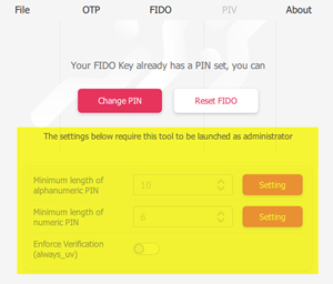 - Modifying FIDO settings (e.g., enforcing user verification, resetting FIDO applet) typically requires launching the app as an administrator.