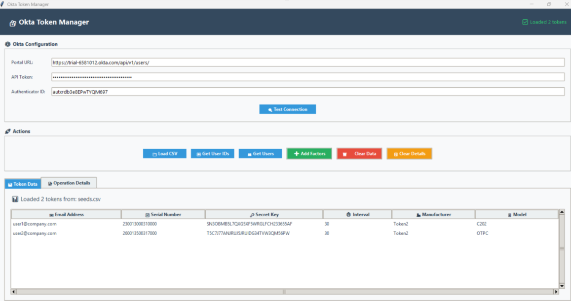 The Okta Token Manager is a GUI-based Python app that supports automatic activation of Token2 Classic OATH tokens during CSV upload. When tokens are assigned to users in the CSV, the app will:✔ Load a CSV file containing OTP token data