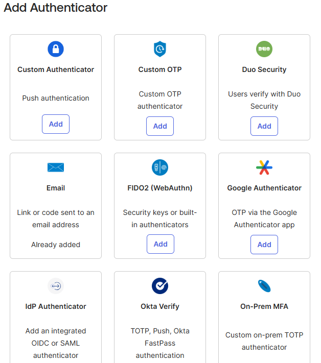 3. Click "Add" next to the "Custom OTP" method. Custom One-Time Password (OTP) allows admins to enroll users in a custom OTP authenticator by importing a seed into Okta and authenticating users with the imported hardware token.