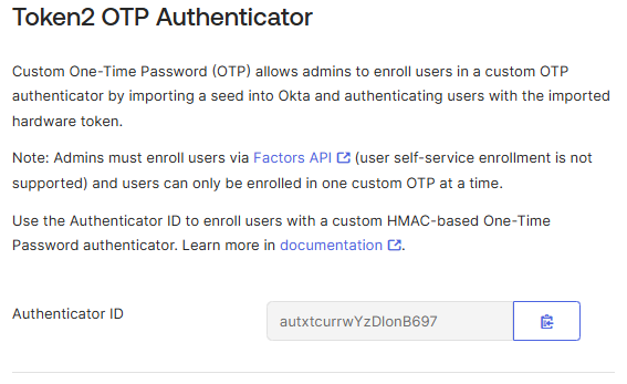 Okta supports Token2 classic tokens as a Multi-Factor Authentication (MFA) method via the Custom TOTP factor.